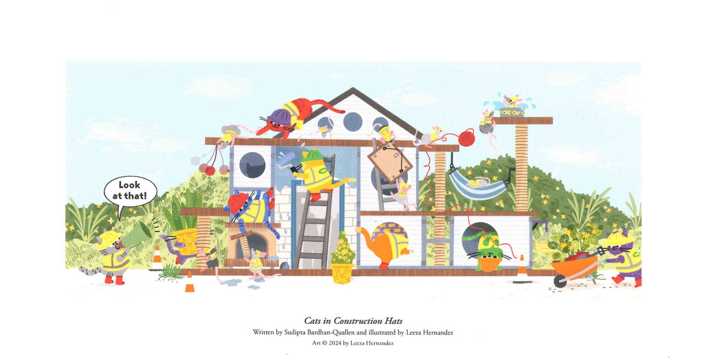 Six colorful cats work together to build a house...with just a little help (and mischief) from some tiny rat friends. Little readers will delight in following along with the simple rhyming text, big construction vehicles, and the failures and triumphs that come with a big project! Bulldozers, cement trucks, excavators, and even a giant crane feature in this story, but each read through also offers smaller details to discover!