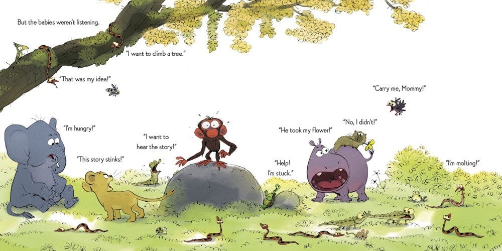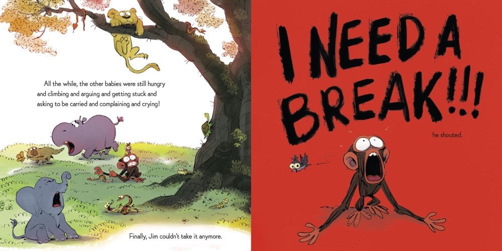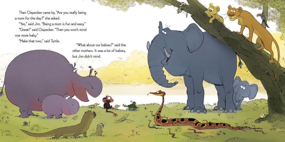 He tries his best but when the baby animals start falling out of a tree, Jim is completely overwhelmed. That’s when his mom swings down, picks him up, calms the baby animals, and makes everything right. Jim understands and appreciates the power of parenting and the unconditional love his mom has for him.