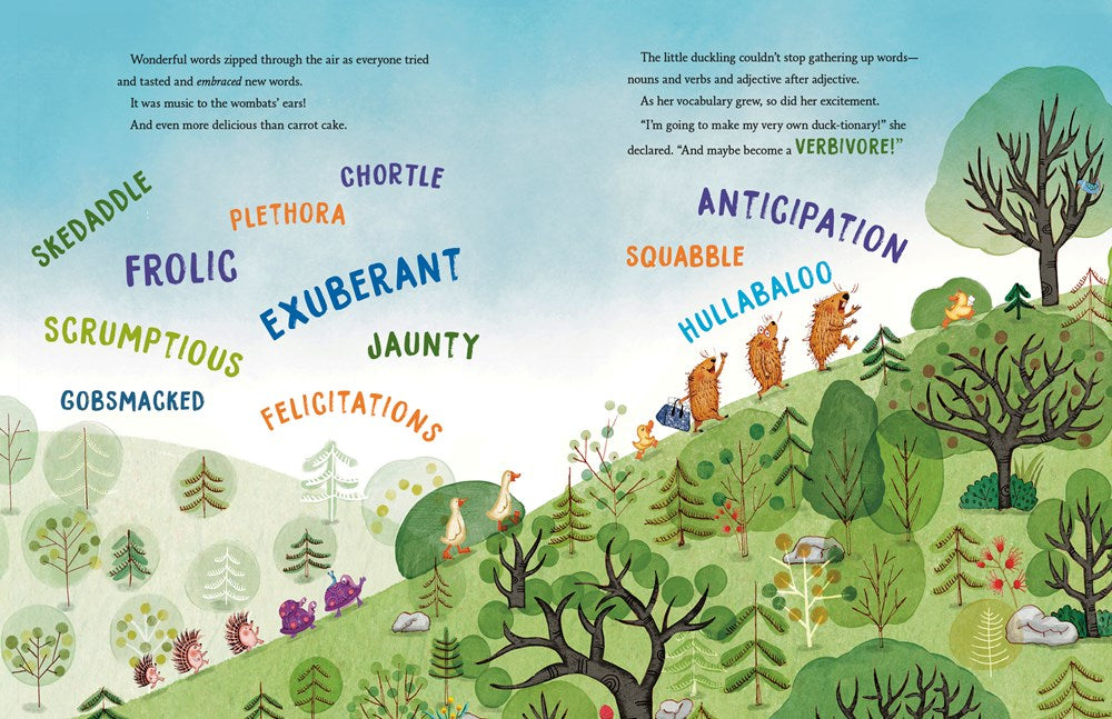 A trio of wandering wombats with a passion for words inspire an enthusiastic duckling to transform her town from dull to dazzling in this delectable picture book that shares with children the magic of words.
