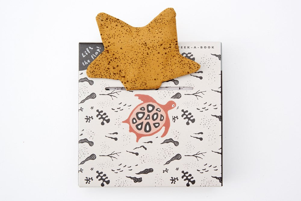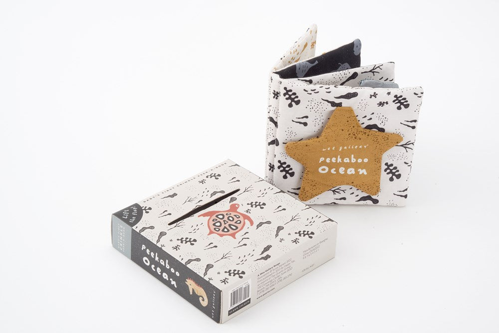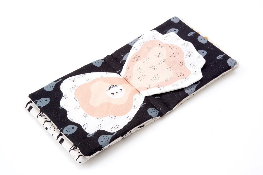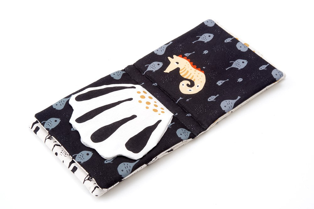 Open out the soft pages of this beautiful, sensory-rich organic cloth book to explore the world of the sea, and play peekaboo with Whale, Oyster, and Ray Fish. Movable, crinkly, cloth ocean creatures are found inside, perfect entertainment for little hands and great at stimulating babies' senses. Move Whale's tail, open Oyster's shell, and look under Ray Fish's fin to see who or what is hiding behind each!