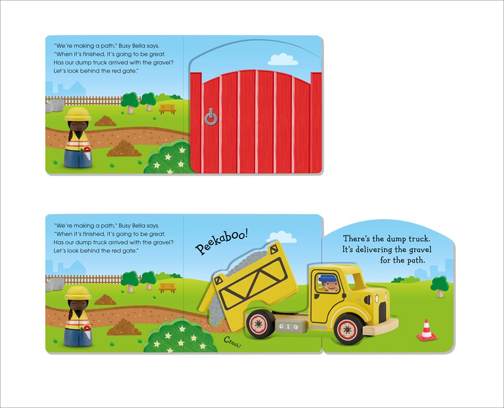 The builders are busy clearing away boulders, laying a path, digging a pond, and filling a sandpit. But where are all the building machines to help them with their work? Babies and toddlers can lift big flaps and play peekaboo with the busy construction vehicles: the bulldozer is behind some boulders, the dump truck is behind a park gate, the digger is behind a huge pile of soil, and the front loader is behind a fence. Finally, all the work is finished, and the park has a new path, pond, and sandpit. But where are the hardworking machines? Lift the flap to find out, then congratulate the incredible construction crew!