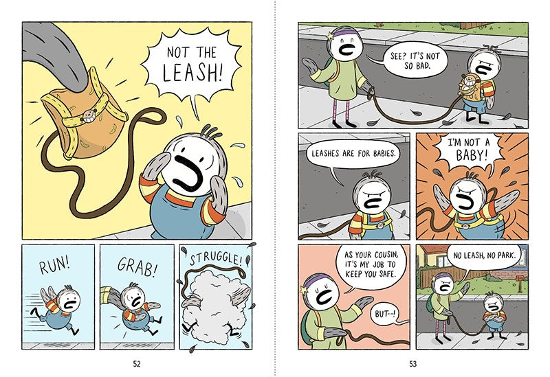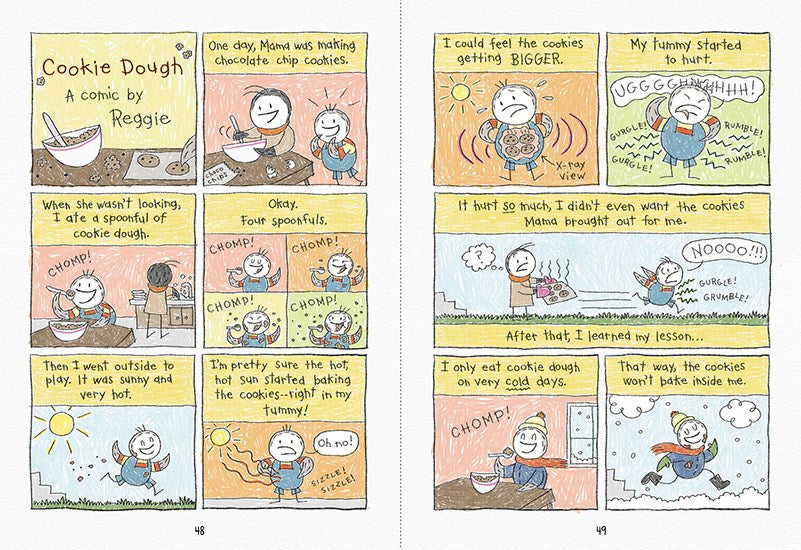 Reggie is just like any other kid: always looking for fun and adventure! But Reggie’s curious, playful side sometimes gets him into trouble. Like when he tries to give himself a haircut before picture day…and ends up gluing his feathers back on his head! Or when he sneaks a mouthful of cookie dough from the kitchen…then feels the sun baking cookies in his tummy! Or when his babysitter puts him on a kid leash while they walk to the park…and he rebels by acting like a dog!