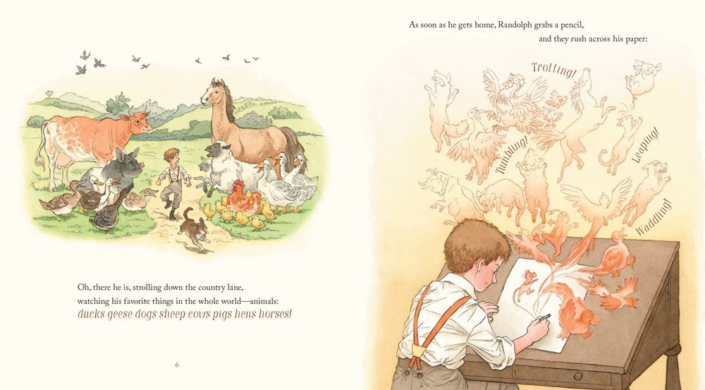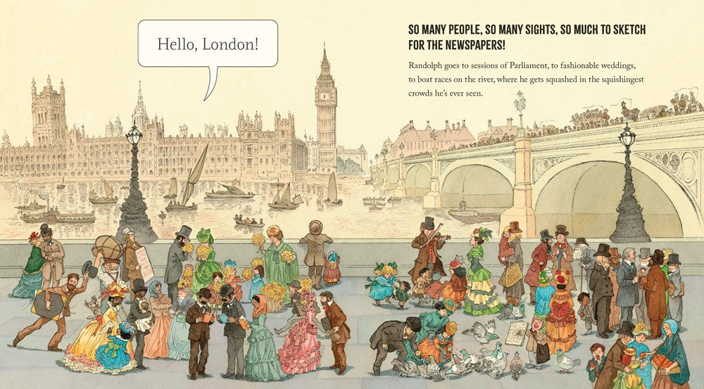 Quick! If you don’t move fast, you’ll miss him—there he goes—Randolph Caldecott, future famous illustrator. His sketchbook is full of hurly-burly: wild weather, frisky animals, and people so sprightly they can barely hold onto the pages. But in the 1850s, there were no children’s books like that. Not yet.