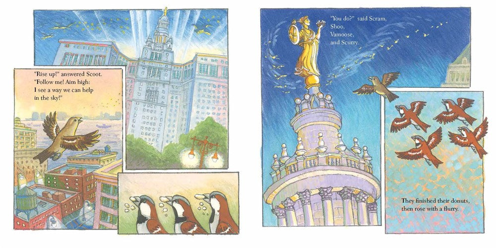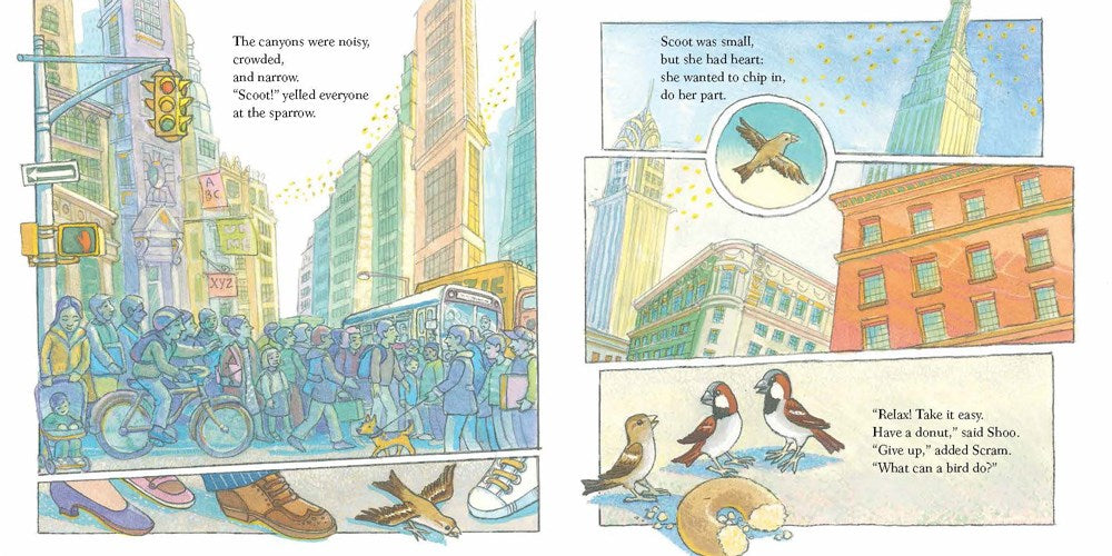 Scoot! Busy people on the bustling New York City streets shout at a little sparrow, but Scoot loves exploring the tasty smells and sparkling sights of the city with her new friend Scram. Busy cabs on Fifth Avenue. Glitzy dancers at Radio City Music Hall. Shoemakers, dressmakers, and bakers working all day. Scoot wants to be a part of it all, but what can a little bird do?