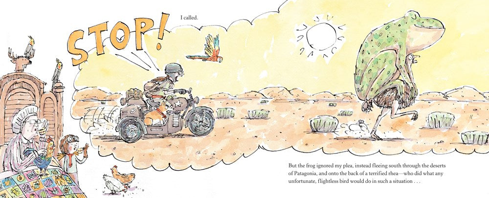 Eccentric Aunt Josephine poignantly ignores a stranger knocking at her door as she tells her niece Sadie the story of her time in the jungles of Peru, cataloguing amphibians for the scientific team of Admiral Rodriguez. When the admiral’s son was suddenly swallowed by a giant frog, Aunt Josephine gave chase in a journey which took her around the world.In the tradition of Philip Stead and Caldecott Medalist Matthew Cordell’s previous collaborations Special Delivery and The Only Fish in the Sea, this is a story full of rambunctious fun and sensationally appealing artwork.