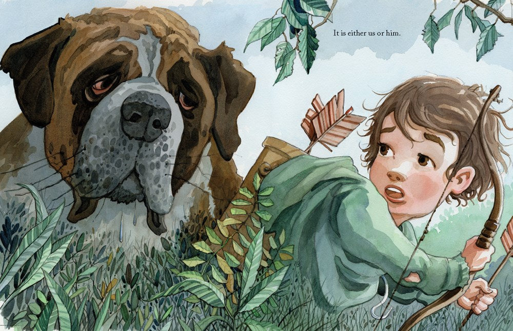 A boy and his younger sister set off to live a life of adventure in the untamed wilds of their own backyard in this funny and beautifully illustrated picture book.We are wild.We are children of the forest. We were raised by wolves.And racoons. And owls. Grabbing a bow and quiver, a boy sets off with his younger sister, a toddler, to live off the land in the expanses of their own backyard. First, they sneak past their snoozing father to pilfer supplies from the refrigerator, but only what they need. After that, they’re utterly on their own. Out in these uncharted spaces they encounter many dangers, from a ferocious mountain lion (a house cat) to a hulking canine beast (their dog). When the sun dips low, they make a camp complete with defenses to ward off predators.