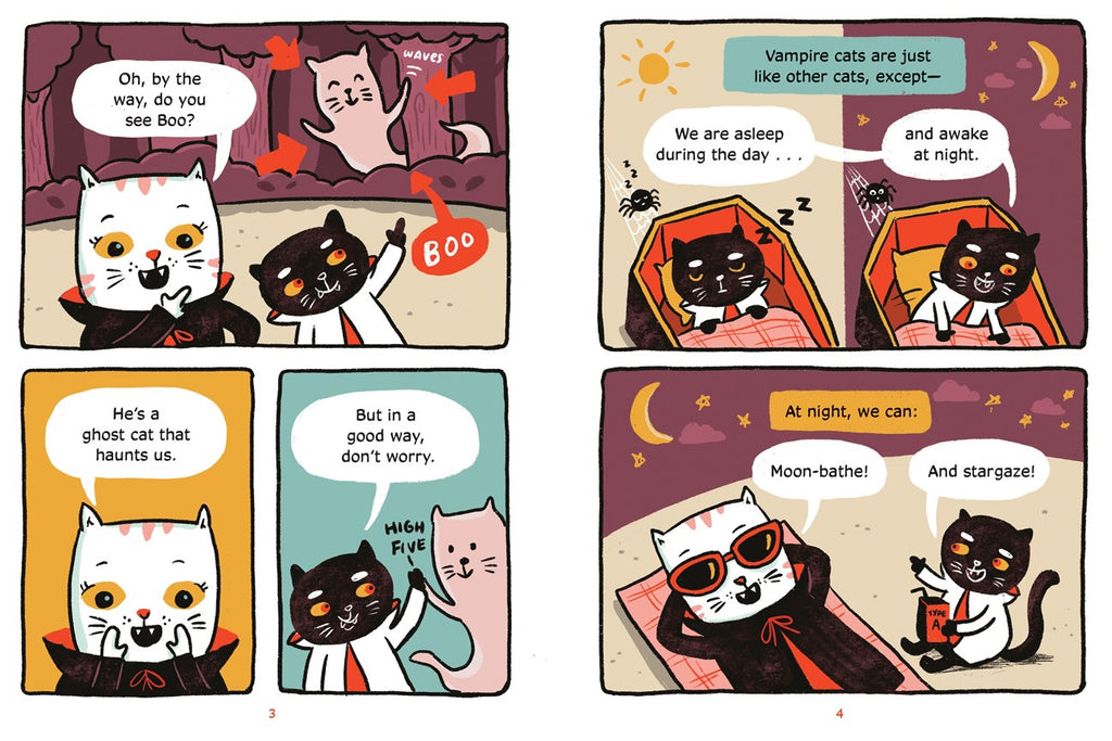 Vampire cats are just like other cats, except they sleep during the day, they only eat red foods, and they go to school at night!