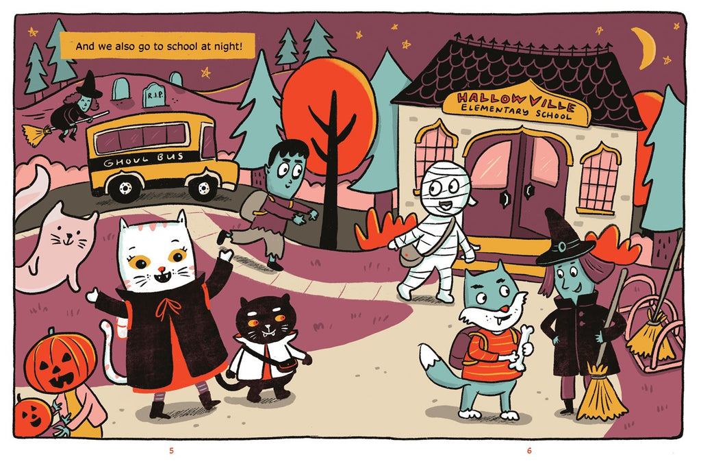 Will their silly schemes work in time? Will they be the only cats in town without the comic? As the two friends explore their community in search of a solution, they’ll meet witches, werewolves, and other monster neighbors in this delightful adventure for young graphic novel readers. Jannie Ho’s adorably cute art is filled with Halloween town worldbuilding. The book also includes a town map, a recipe for muffins, and even a sample of the treasured Frightful comic!