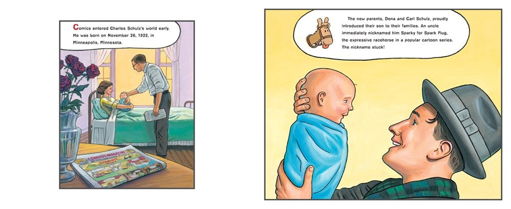 A mixed-panel format picture book biography of Charles "Sparky" Schulz, creator of the beloved comic strip Peanuts.