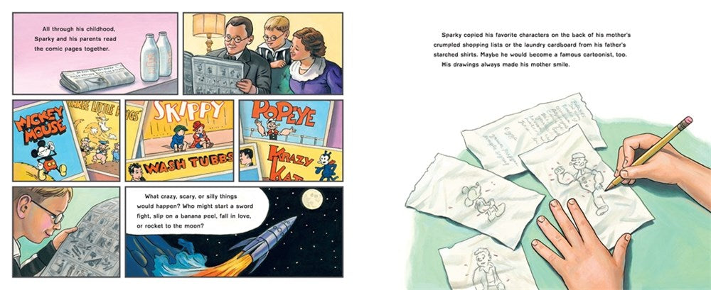As a child, Charles split his free time between adventures outdoors with his friends and dog Spike, and daydreams and doodles inspired by the comics he loved to read. He longed to become a professional cartoonist, but saw his dreams deferred by unexpected challenges that laid ahead: military deployment to the European front of World War II, and the heartbreak of a family tragedy back home. Even so, Charles never lost sight of the hopeful joy of his early years and his love for Spike, both of which inspired Peanuts. The comic strip went on to become the most popular and influential in comics history.