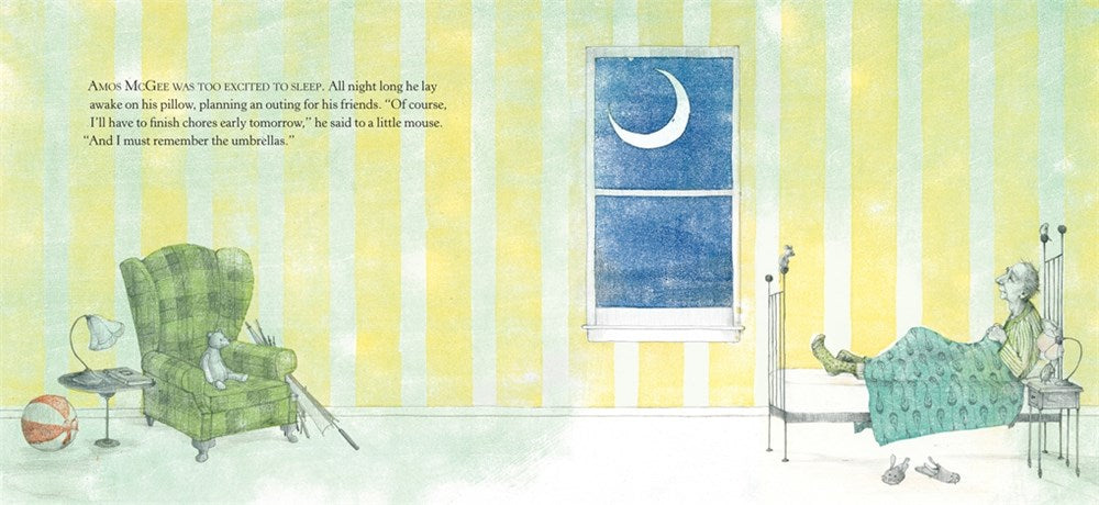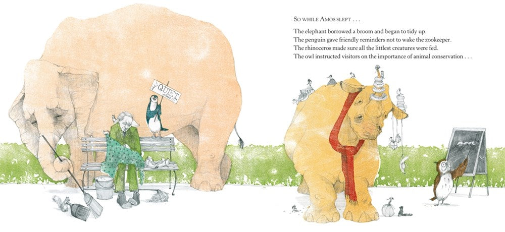 Amos McGee, a friendly zookeeper, is very considerate and always on time. But after a late night planning a surprise for all his friends, Amos is tired. So tired that he falls asleep during breakfast and misses his bus to the zoo!
