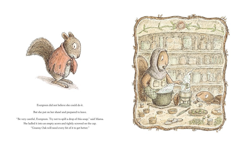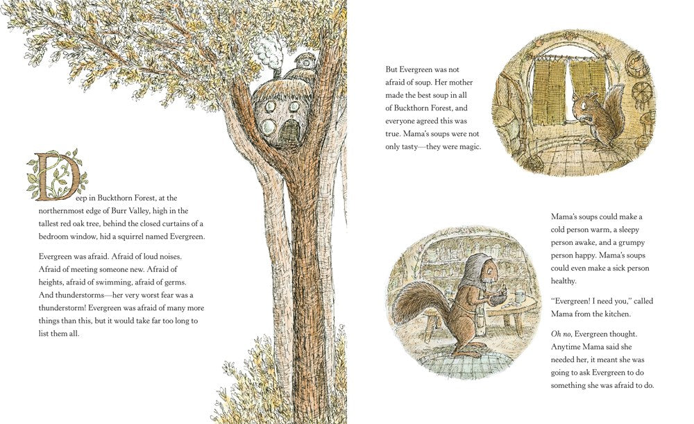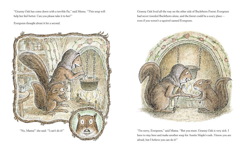 Evergreen the squirrel is afraid of many things: thunder, hawks, and the dark paths of Buckthorn Forest. But when her mother tasks Evergreen with delivering soup to her sick Granny Oak, the little squirrel must face her fears and make the journey.