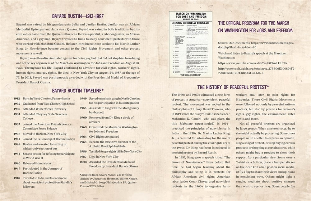 Credited with introducing Dr. Martin Luther King, Jr. to the power of peaceful protest, for orchestrating the March on Washington, and for skillfully composing the program that placed Dr. King at the end of the list of speakers and musicians for what would become his historic “I Have a Dream” speech, this unsung hero will be celebrated for the first time in a picture book.