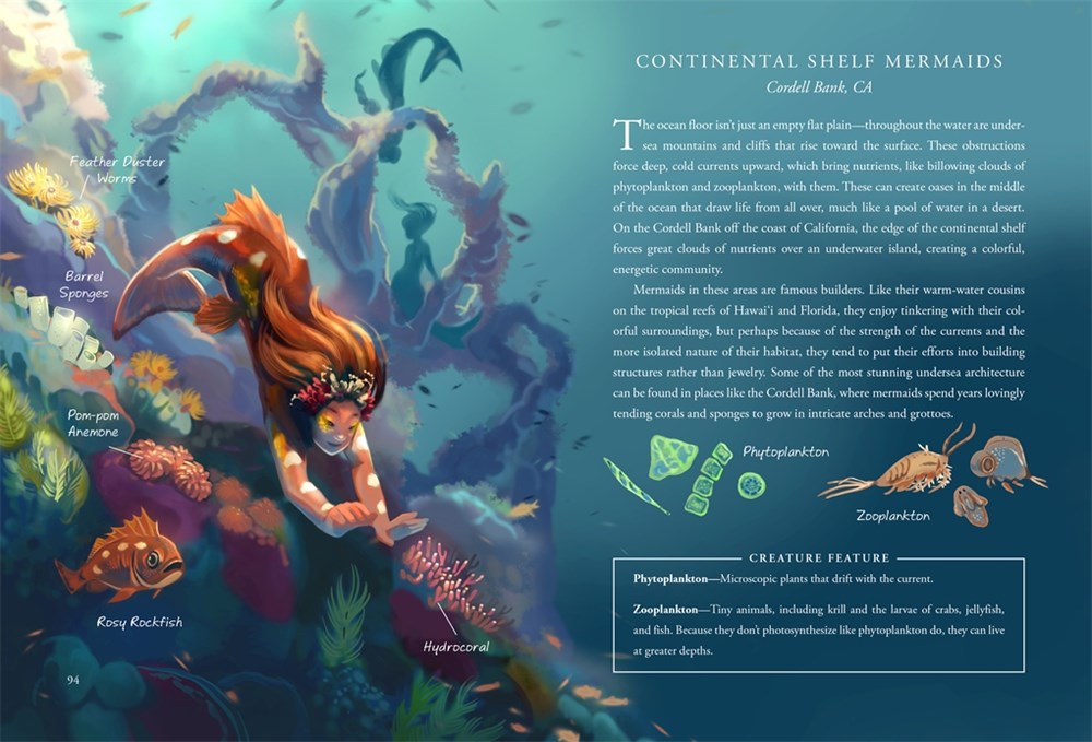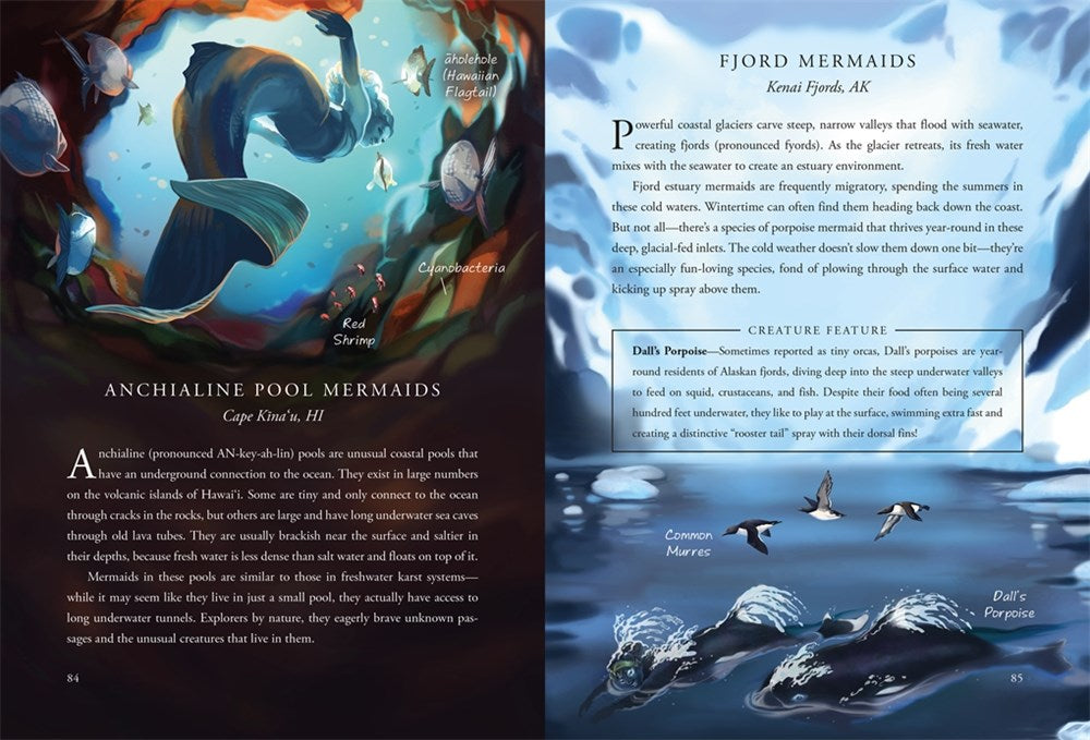 A gorgeous and vibrantly illustrated field guide cataloging various species of mermaids, based on real ecological details—with a strong environmental focus—perfect for fans of The Magical Unicorn Society.
