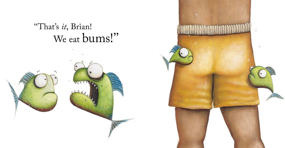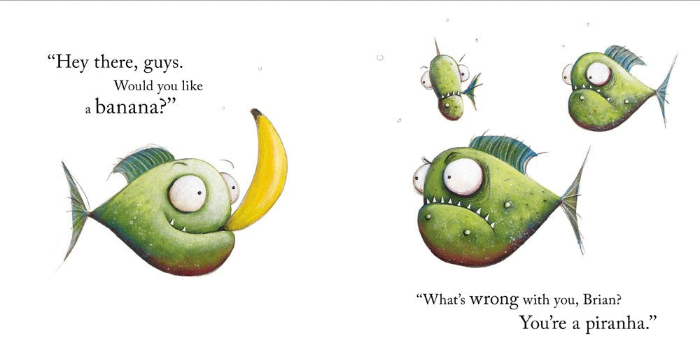 Everyone knows that piranhas don't eat bananas -- except for Brian. This little fish loves to munch not only on bananas, but on fruit of all kinds! Brian's piranha friends think he's crazy. Piranhas don't eat bananas -- their sharp teeth are for eating meat! And there's a scrumptious pair of feet dangling in the water nearby...