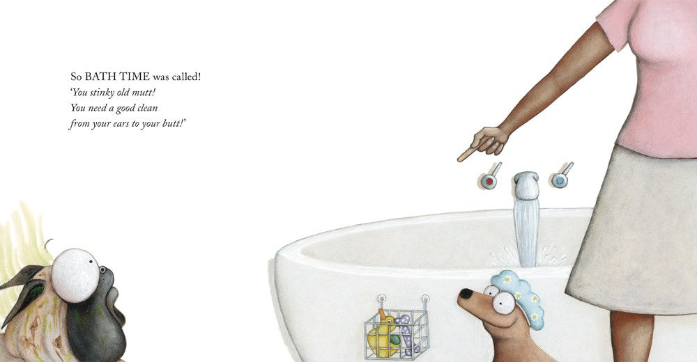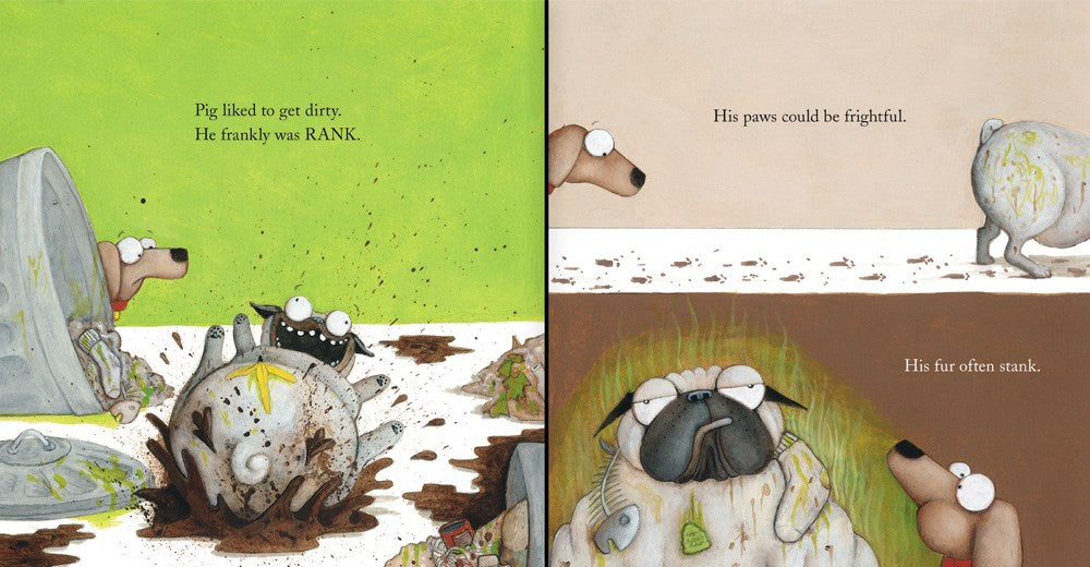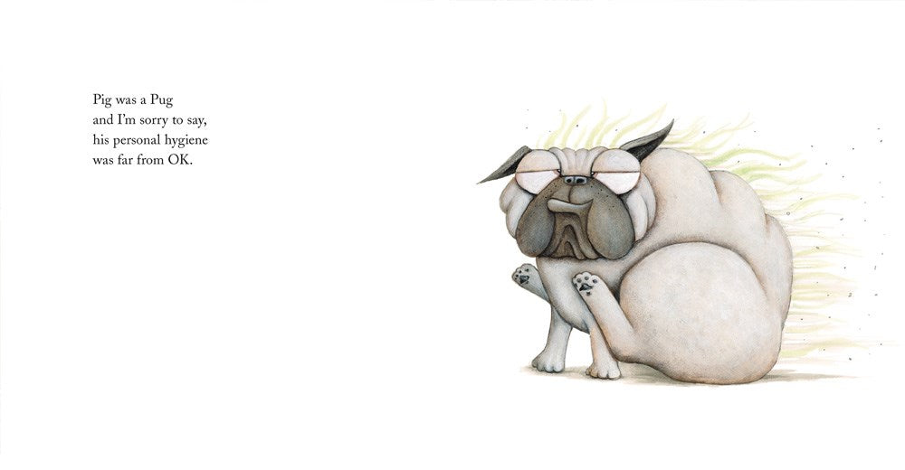 In this hilarious adventure, Pig the Pug STINKS! Pig likes to be smelly, so he rolls around in the garbage, laps up spoiled milk, tracks dirty paw prints all over the house, and even sticks his head in the toilet! But enough is enough! Pig's owner tries to get him to take a bath, but Pig refuses! Pig has a plan to stop up the tub, but when it backfires, will Pig get clean after all?
