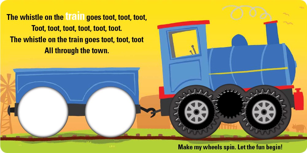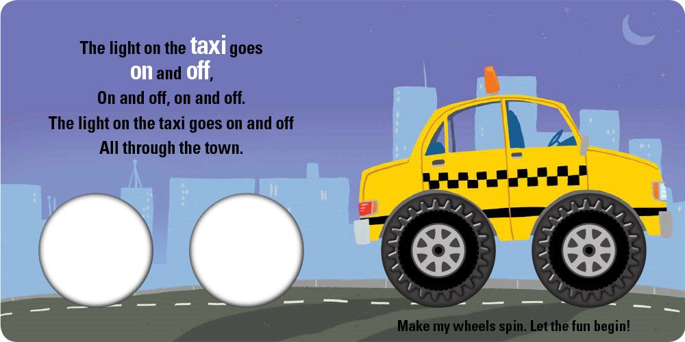 Toddlers will love spinning the oversized, chunky cardboard wheels on every page while they sing along to their favorite song, "The Wheels on the Bus!" Each song verse introduces a different vehicle and sound effect, from the honking horn on the truck to the vrooming engine on the motorcycle. With sturdy, chunky, spinnable wheels on every spread and a fun twist on a preschool-favorite song, this novelty book is irresistible for any transportation-obsessed little one!