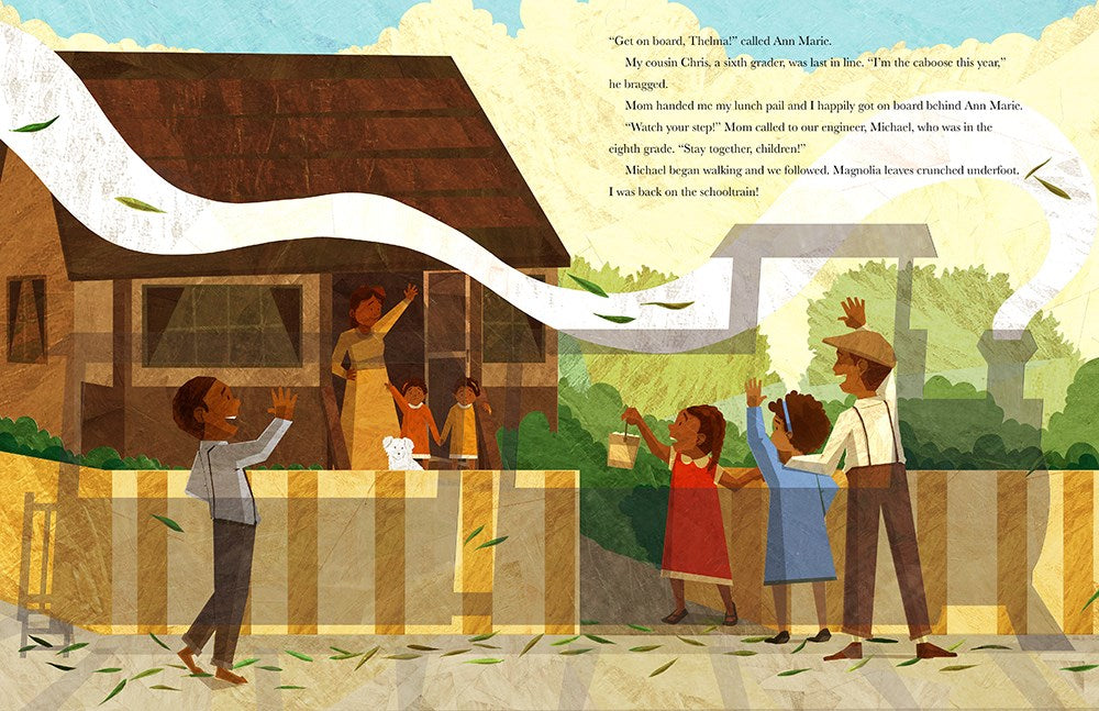Thelma loves to watch the Sunset Limited chug through her little town of Vacherie, Louisiana. And she dreams of one day riding a real train! For now, she has her beloved schooltrain. Every morning, she and her friends walk to school, single file, chanting all the way: