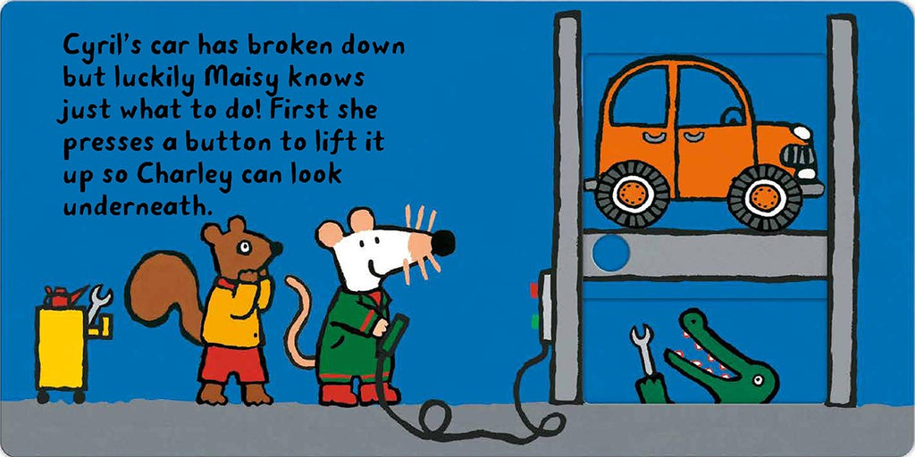 Maisy is fixing Cyril's car, and she needs your help! With easy-to-use pull, slide and play tabs on every spread, little ones will love this interactive garage experience.