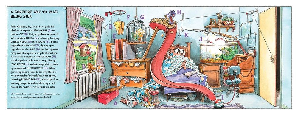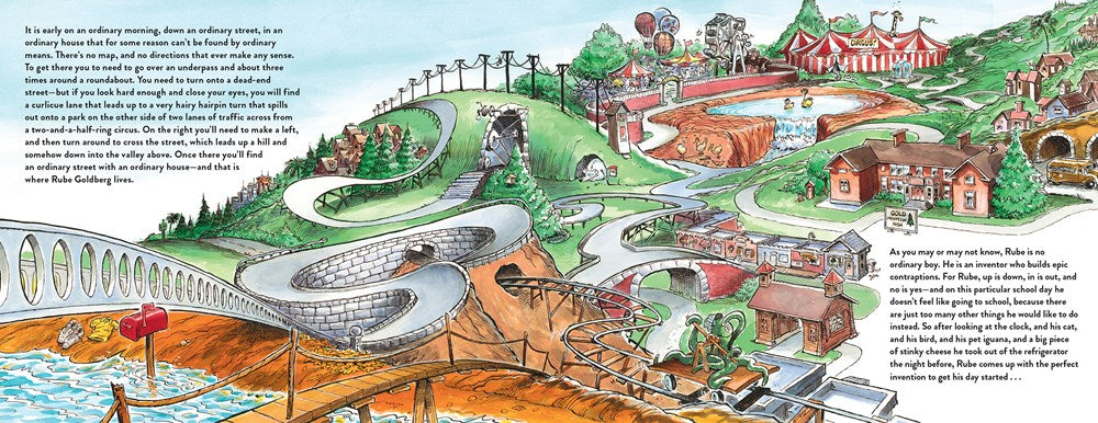 In their latest collaboration, they imagine Rube Goldberg as a young inventor who builds complex machines to solve simple, everyday problems. Follow along as he invents zany chain-reaction contraptions to have the best day off from school ever—including a simple way to play fetch in the yard without leaving his bedroom, a self-operating swing, and a super simple series of movie snacking machines.