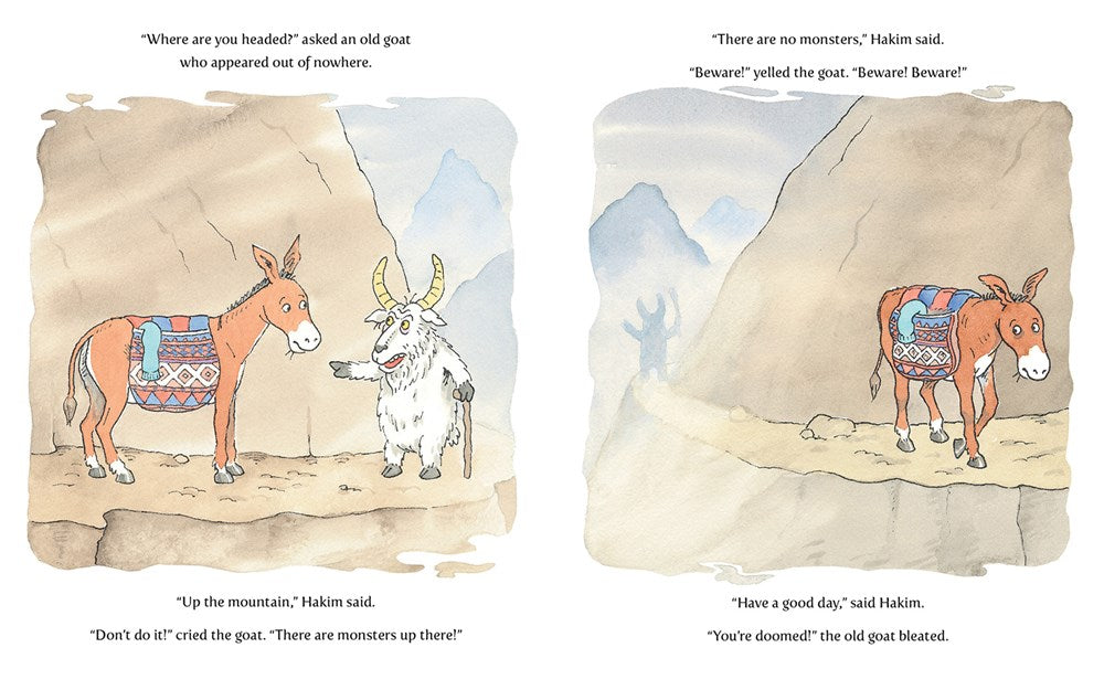 Hakim is traveling up the mountain to visit his friend Daisy, but the fog is so thick that he can't see the road ahead. Then an old goat appears out of nowhere and delivers a sinister warning: “Beware! Beware! There are monsters up there!”