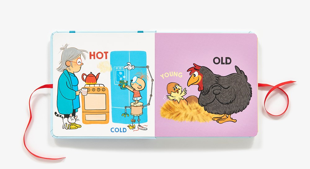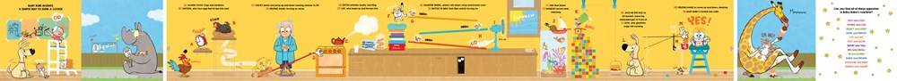 This inventive board book combines the hilarious hijinks of the Rube Goldberg brand with a unique and exciting format to explore the key concept of opposites in a whole new way. On one side of the accordion-fold pages, discover 12 pairs of opposites—from hot and cold to young and old and shallow and deep to awake and asleep. Turn the book over to discover Baby Rube Goldberg’s ingenious and out-of-the-box invention that includes all 12 sets of opposites and demonstrates a “simple” way to dunk a cookie in milk! Written by Jennifer George, Rube Goldberg’s granddaughter and the legacy director of Rube Goldberg, Inc., and featuring the brilliant illustrations of Vin Vogel,