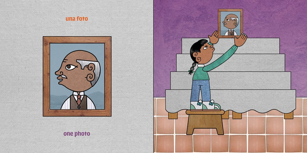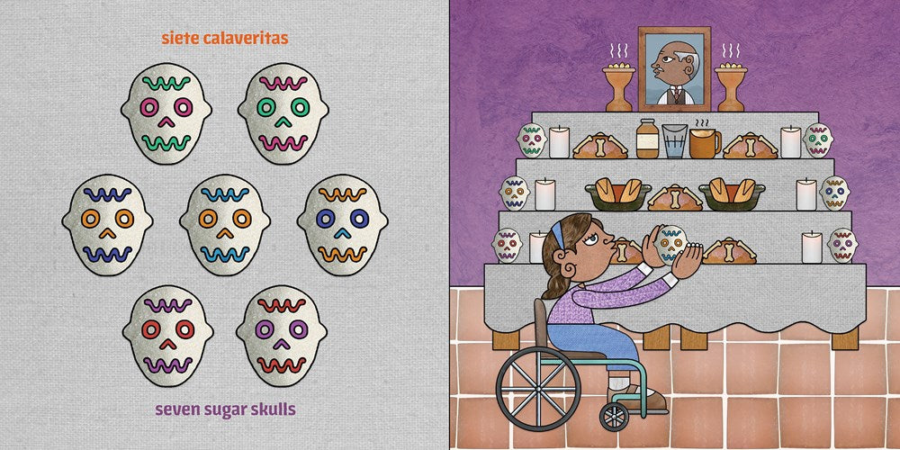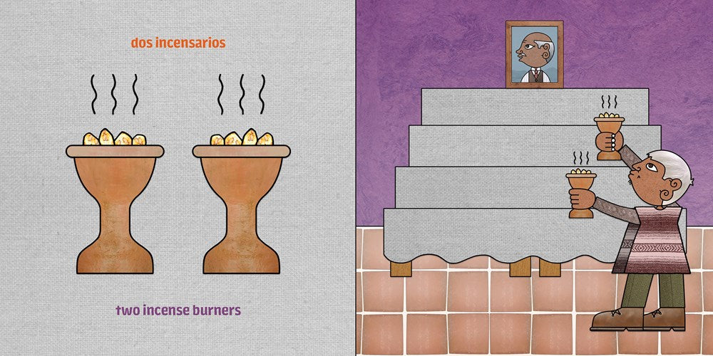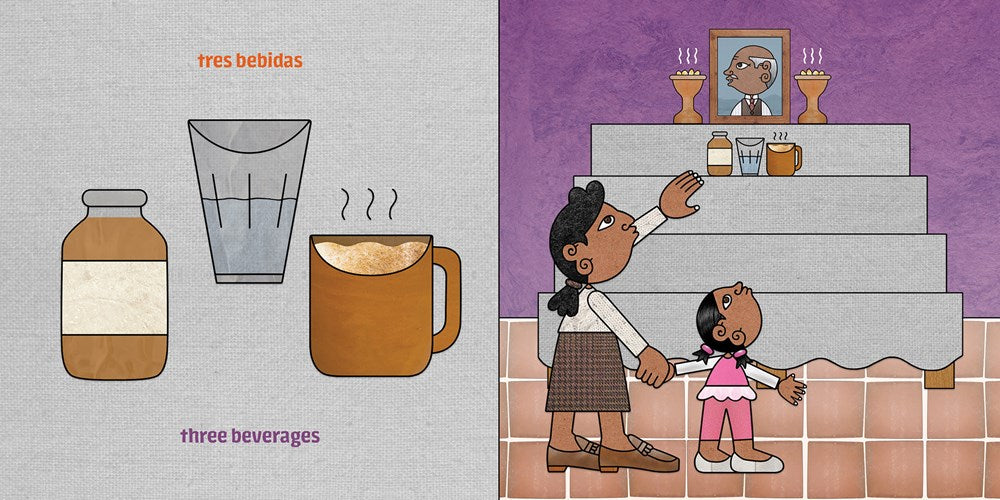 From award-winning and beloved author-illustrator Duncan Tonatiuh comes this celebratory bilingual picture book centering on a Día de Muertos ofrenda (Day of the Dead altar), constructed annually to honor the memory and welcome the spirit of a loved one. The book uses a counting structure, from one to ten, to focus on family members and their offerings, with a double-gatefold finale that opens to reveal the family gathered around the fully decorated ofrenda with all of their offerings. Included at the back of the book is a brief author’s note that lends additional context on the holiday.