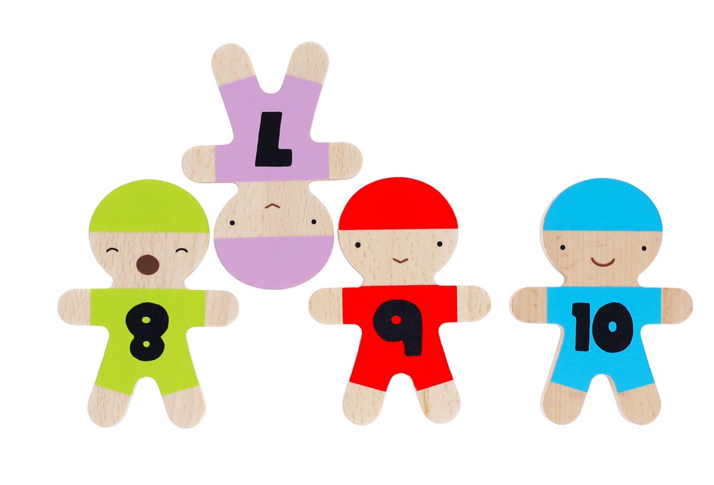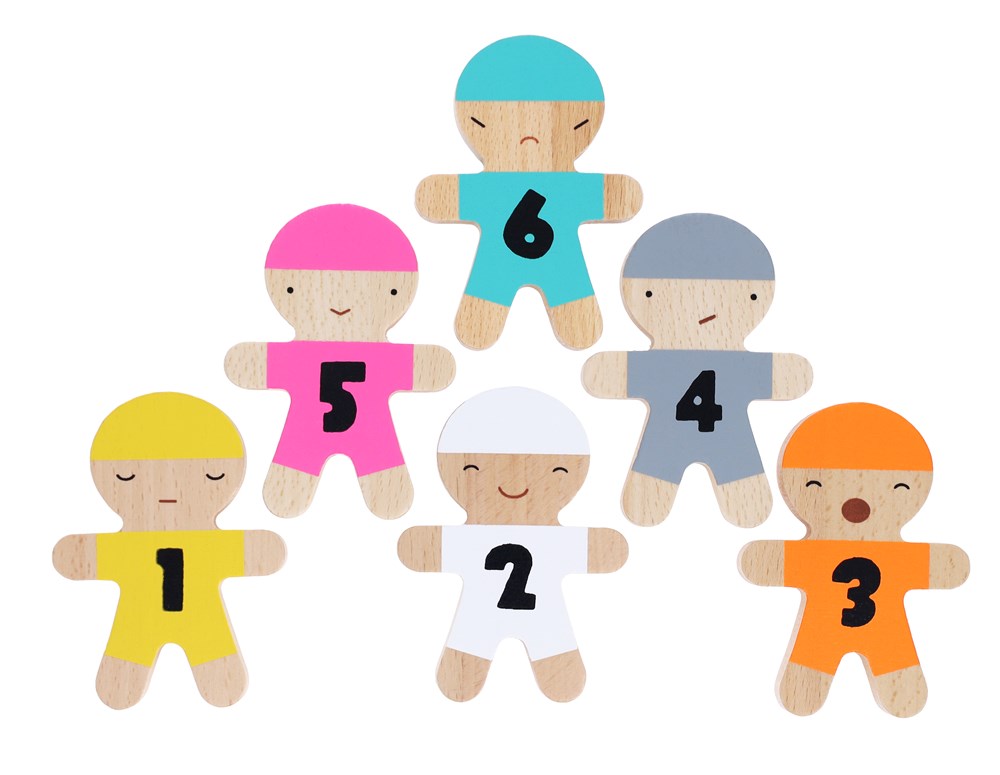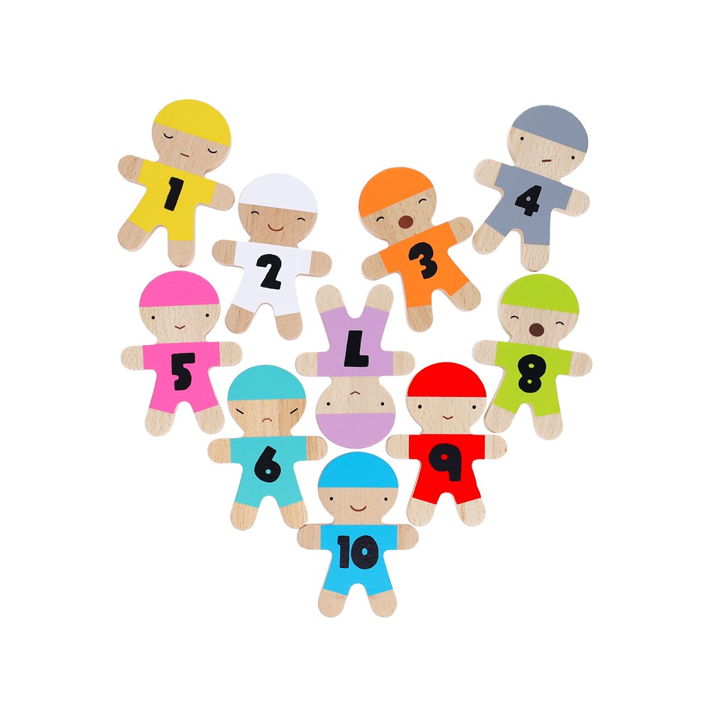 Ten sturdy wooden figures are the perfect playmates for toddlers. Stack them, place them in rows, or engage in free play. Just the right size for little hands, each cheerful character sports a brightly colored outfit and a number, ideal for early learning. And the characters may be stacked and arranged in countless ways!