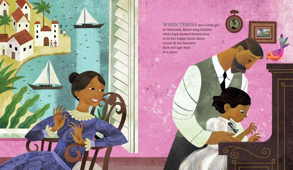 As a little girl, Teresa Carreño loved to let her hands dance across the beautiful keys of the piano. If she felt sad, music cheered her up, and when she was happy, the piano helped her share that joy. Soon she was writing her own songs and performing in grand cathedrals. Then a revolution in Venezuela forced her family to flee to the United States. Teresa felt lonely in this unfamiliar place, where few of the people she met spoke Spanish. Worst of all, there was fighting in her new home, too—the Civil War.