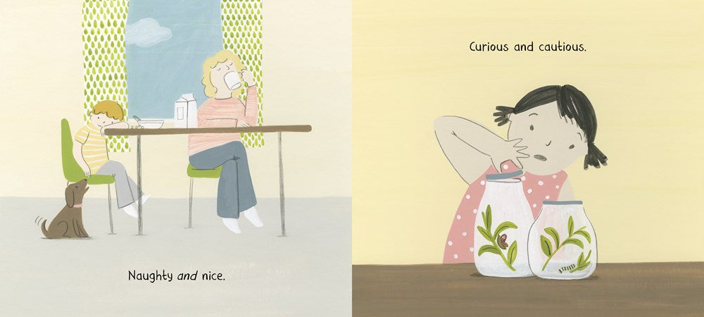 Naughty and nice? Busy and bored? People can be different things --- at the same time! This deceptively simple book uses children's everyday experiences to explore human complexity. Each page features a child embodying two seemingly contradictory characteristics. For example, a boy's bouquet of balloons makes him lucky, but since one has floated away, he's unlucky at the same time. In another, a girl making sure the food she's pouring lands in her cat's bowl is careful, but since her foot has knocked over the bag of food, she's also clumsy. Full of clever observations, it's sure to pique kids' curiosity and make them wonder --- How many different things am I?