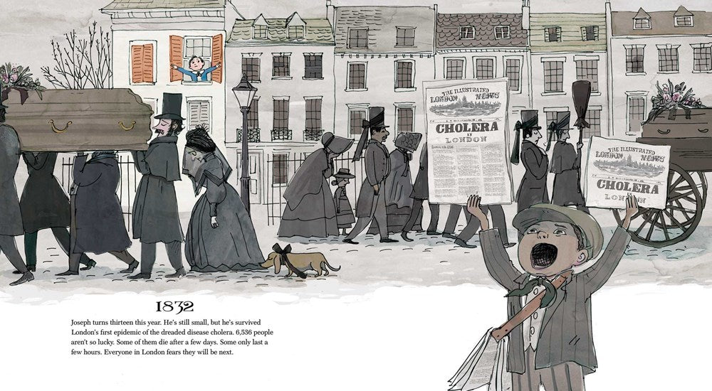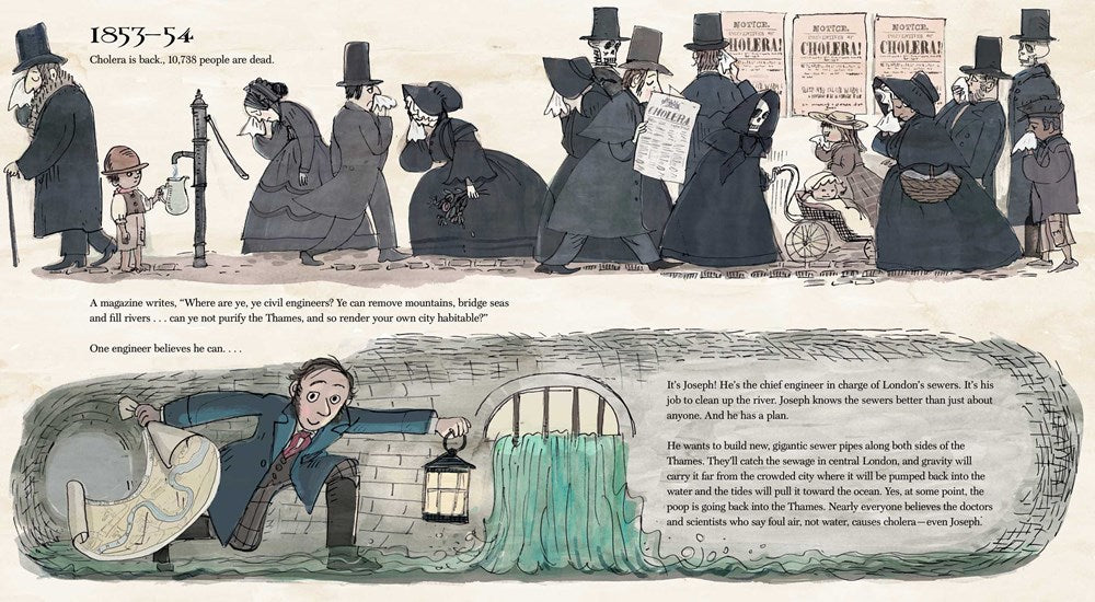 Discover the true story about the determined engineer who fixed London’s pollution problem in this funny, accessible nonfiction picture book featuring engaging art from the illustrator of Queen Victoria’s Bathing Machine.It’s the summer of 1858, and London’s River Thames STINKS. What is creating this revolting smell? The answer is gross: the river is full of poop.But the smell isn’t the worst problem. Every few years, cholera breaks out, and thousands of people die. Could there be a connection between the foul water and the deadly disease?One engineer dreams of making London a cleaner, healthier place. His name is Joseph Bazalgette. His grand plan to create a new sewer system to clean the river is an engineering marvel. And his sewers will save lives. Nothing stinky about that.With tips for how to prevent pollution today, this fascinating look at science, history, and what one person can do to create change will impress and astound readers who want to help make their planet a cleaner, happier place to live.