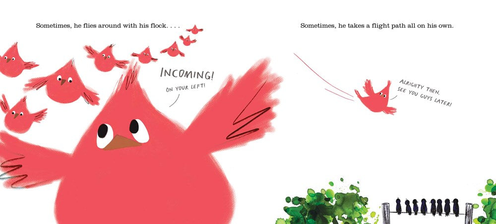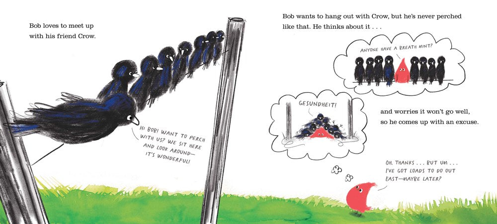 No longer afraid of flying, Bob loves visiting friends…until Crow invites him to sit and perch for a while. Perch? Bob isn’t sure if he’d like perching. So he makes up an excuse and off he flies. But no matter where he goes, Bob meets someone who invites him to try something new (swimming! bagels! tater tots!), and poor, uncertain Bob keeps flying away until he’s flown himself ragged!