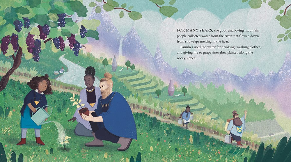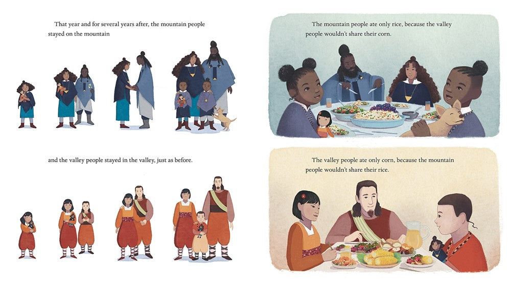 Season after season, the mountain people give life to their crops with water from the river, while the valley people use water from a nearby lake to nourish their fields. Despite their similarities, neither allows the other to seek water on their land—instead, they exchange harsh words, and when drought descends, they come to blows. But when the hottest summer yet brings torrential downpours, the waters overflow and trap the valley people. A wise mountain girl sees their plight and says, “We need to help.”