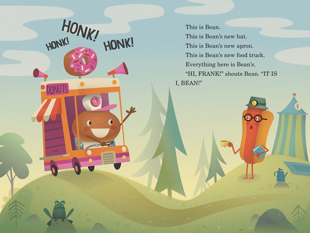 Here comes Bean with his new food truck! It is fun on wheels! It’s a rolling party! Bean is going to Food Truck Friday to sell his donuts. Bean’s donuts have zip. They have zing. They are sure to win the competition! Frank has something to sell, too. He has oatmeal. Oatmeal is boring. It needs zip. It needs zing. What if Bean’s donuts could help Frank’s oatmeal? What if donuts and oatmeal could work together, just like friends?