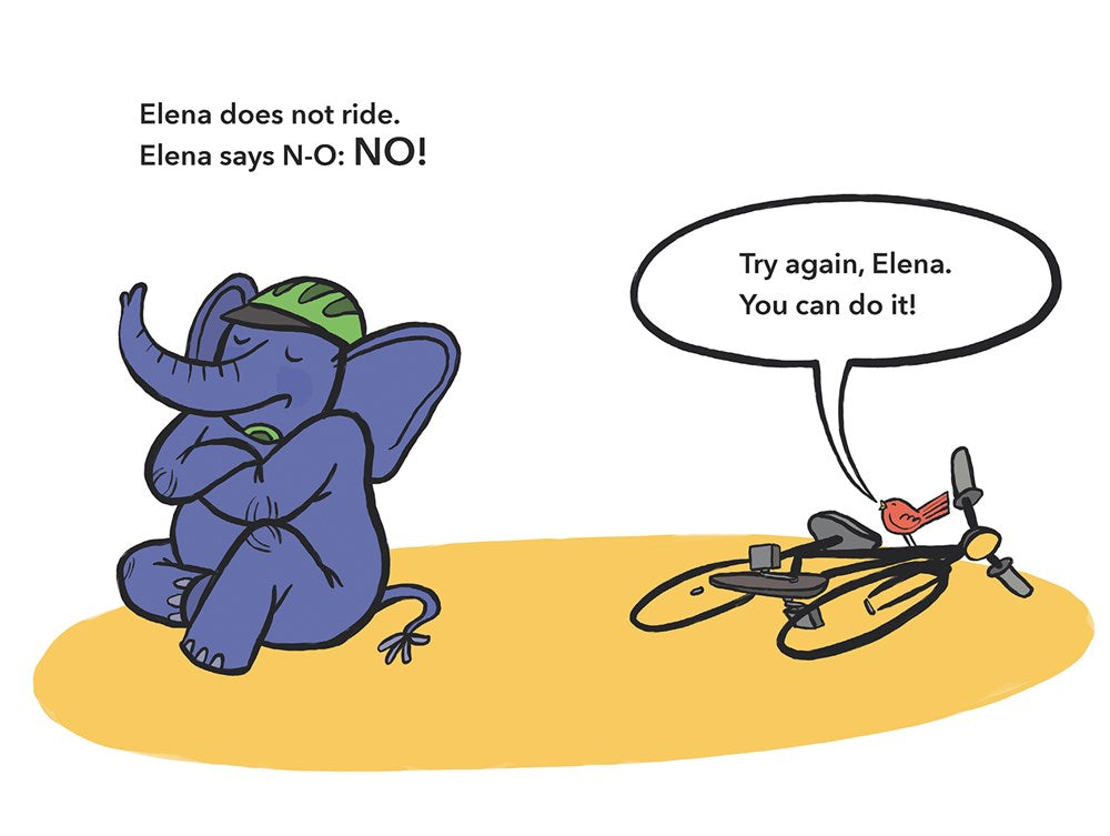 Learning to ride a bike is hard. But Elena can do it. She just has to try, try again. With this reassuring story of childlike persistence, Juana Medina, creator of the acclaimed Juana & Lucas series, introduces Elena, a plucky elephant, and the little red bird who is Elena’s faithful cheerleader. Simple, energetic text and bold, brilliant artwork convey a relatable tale of the ups and downs of learning something new (not without protest or tears) and the final thrill of mastery that will have children rooting for Elena and ready for her next adventure.