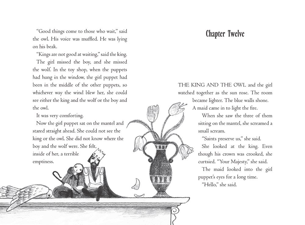 Shut up in a trunk by a taciturn old sea captain with a secret, five friends—a king, a wolf, a girl, a boy, and an owl—bicker, boast, and comfort one another in the dark. Individually, they dream of song and light, freedom and flight, purpose and glory, but they all agree they are part of a larger story, bound each to each by chance, bonded by the heart’s mysteries. When at last their shared fate arrives, landing them on a mantel in a blue room in the home of two little girls, the truth is more astonishing than any of them could have imagined. A beloved author of modern classics draws on her most moving themes with humor, heart, and wisdom in the first of the Norendy Tales, a projected trio of novellas linked by place and mood, each illustrated in black and white by a different virtuoso illustrator. A magical and beautifully packaged gift volume designed to be read aloud and shared, The Puppets of Spelhorst is a tale that soothes and strengthens us on our journey, leading us through whatever dark forest we find ourselves in.