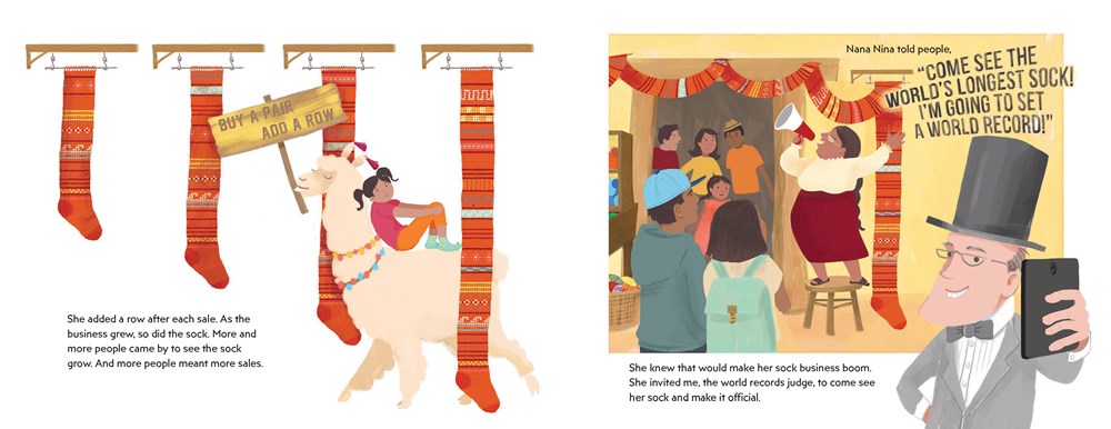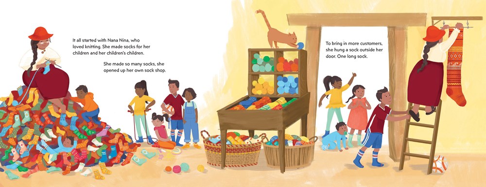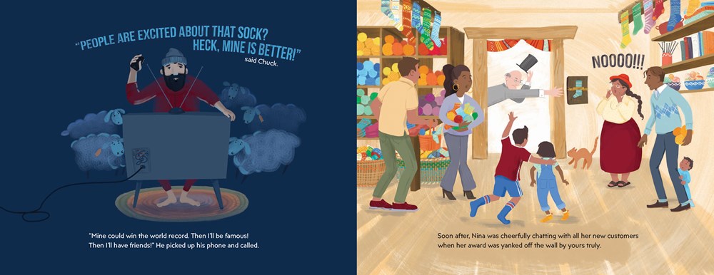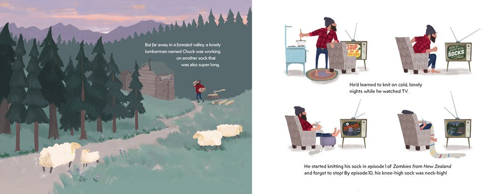 In Chile, Nana Nina starts knitting a sock and forgets to stop, and soon it's won the world record for "Longest Sock”! When Chuck, a lonely lumberman in New Zealand who also happens to be knitting a very long sock, sees Nina’s news on the TV, he is determined to beat her world record. And he does! Thus begins a battle of the knittest to see who can hold onto the world record—for good. The world takes sides: Team Nina or Team Chuck. But will all the pressure cause them to unravel? This yarn about a competition out of control will charm the socks off readers of all ages and knitting abilities.
