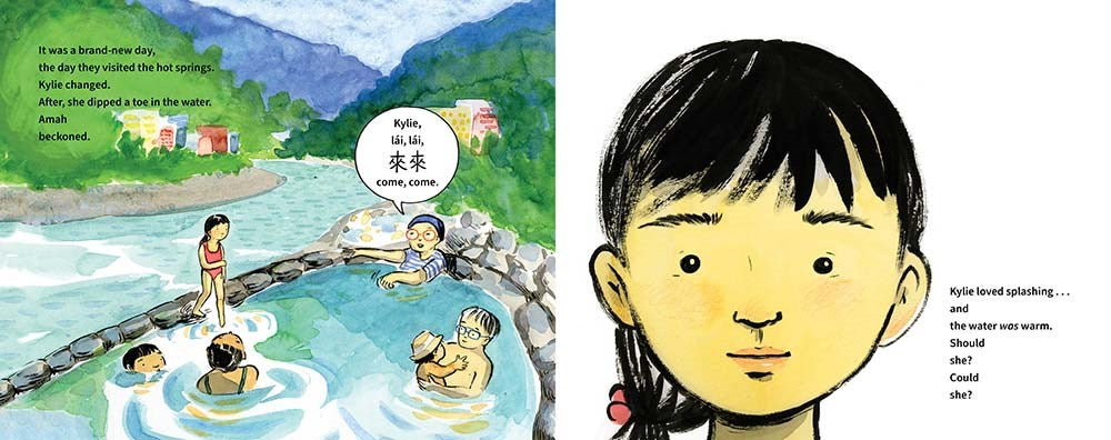 However, after she is invited by Amah — Lái kàn kàn! Come see! — to play and splash in the hot springs (which aren’t that different from the pools at home), Kylie begins to see this place through her grandmother’s eyes and sees a new side of the things that used to scare her.