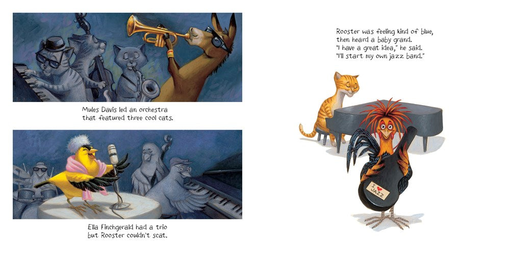 Acoustic Rooster forms a jazz band with Duck Ellington, Bee Holliday, and Pepe Ernesto Cruz to compete in the annual Barnyard Talent Show against such greats as Thelonius Monkey, Mules Davis, and Ella Finchgerald. Includes glossary, notes on the characters and songs, and jazz timeline.