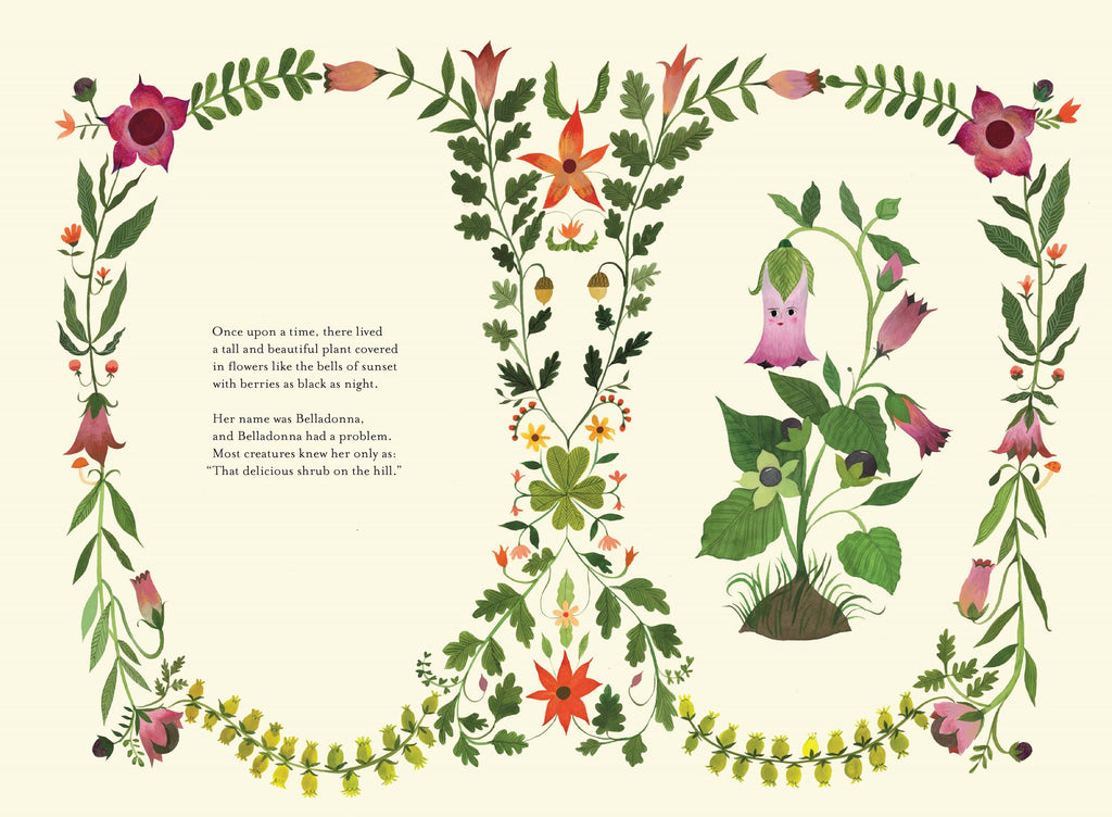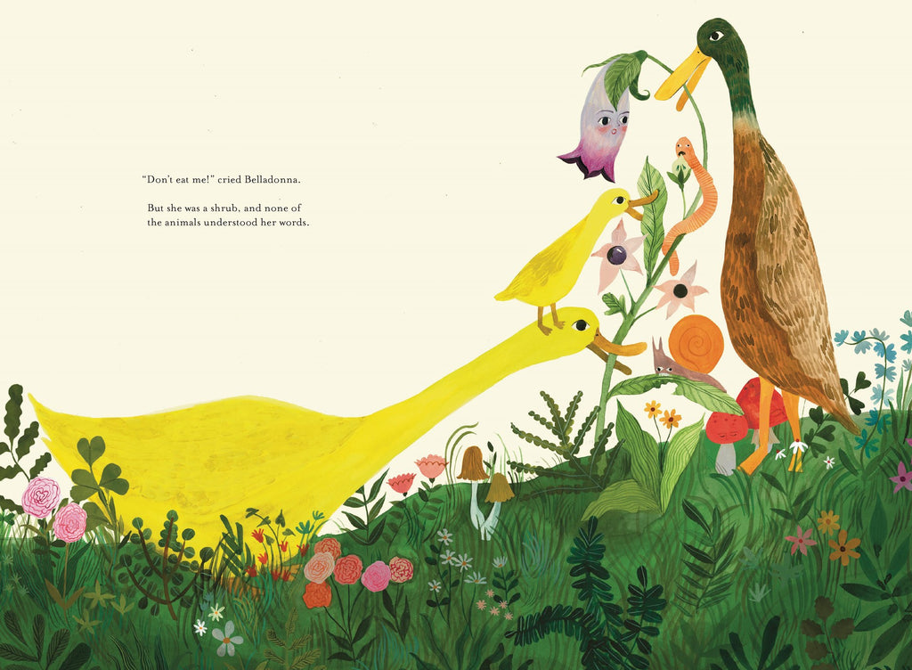 Everyone in the forest knows about Belladonna—that tall, beautiful plant whose berries are so delicious that they’re forever being gobbled up. Day after day, poor Belladonna is nibbled at until there’s almost nothing left of her. But unlike the animals who can leap, climb, or fly away, Belladonna, being a plant, is firmly rooted in place. So what’s a plant to do to survive?