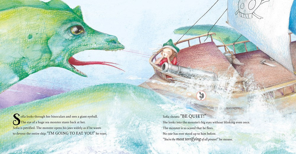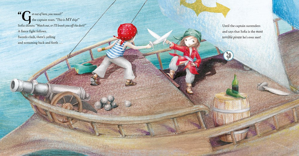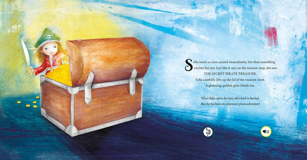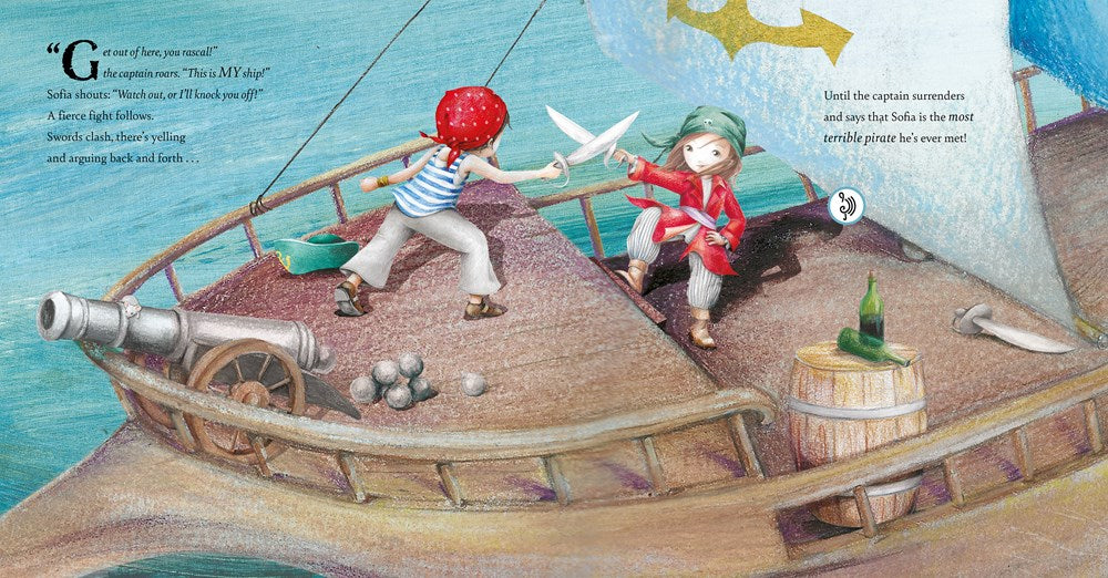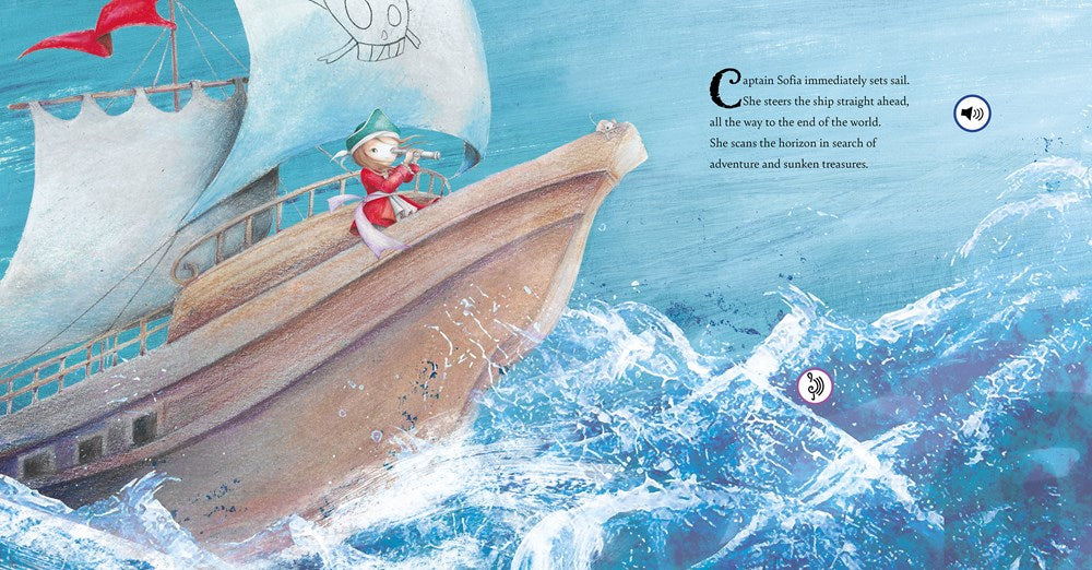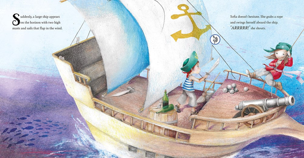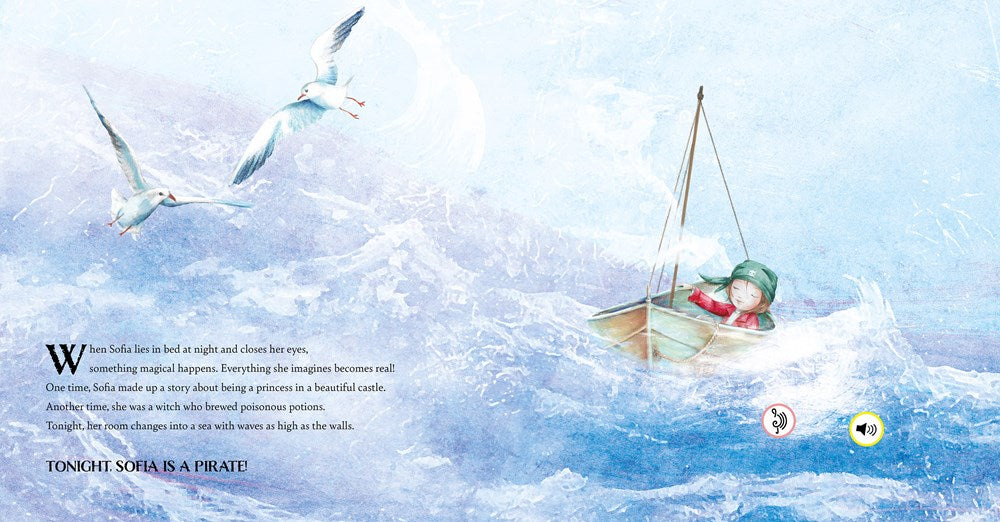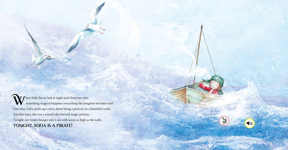 Sometimes, when Sofia lies in bed at night and closes her eyes, something magical happens: everything she imagines becomes real! Tonight, her room changes into a sea with waves as high as the walls. Tonight, Sofia is a pirate!