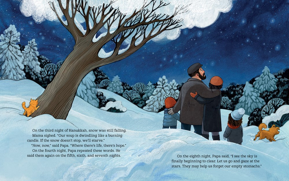 The Menashes love latkes and applesauce during Hanukkah. But a blizzard begins and erases any hope that they’ll harvest potatoes and apples in time. When a stray cat and dog show up, there’s not a lot of food to offer them, but kindness prevails, and they’re invited in. It turns out that the dog—Latke—and the cat—Applesauce—save the day.