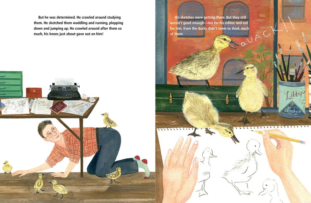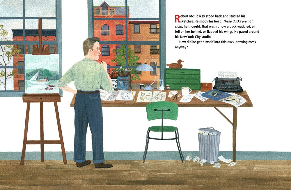 While writing and illustrating the beloved picture book Make Way for Ducklings, Robert McCloskey brings a flock of ducklings into his tiny New York City apartment. But an artist + a bunch of ducklings in his apartment = chaos! There are ducklings in the bathtub and ducklings in the kitchen, quacking at dawn and sitting on his desk. Can he learn to draw them just right before they grow too big?