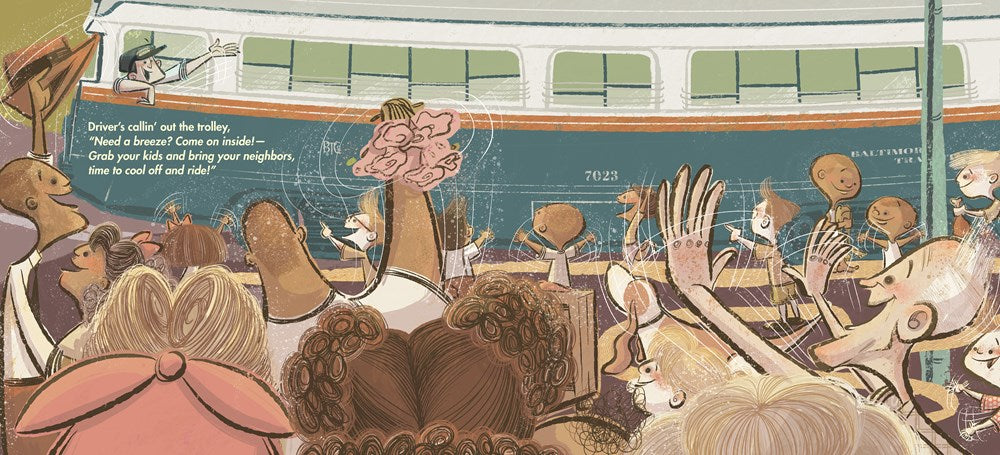Everyone in Baltimore is hot and sticky, from little Hazel playing on the slide to the grandma knitting on the porch. So when evening comes, they all jump at the chance for a little "cool off and ride." The whole neighborhood–from the Taylor twins to Grandpa, and even the dog!—piles onto a breezy homemade roller coaster, a city trolley!