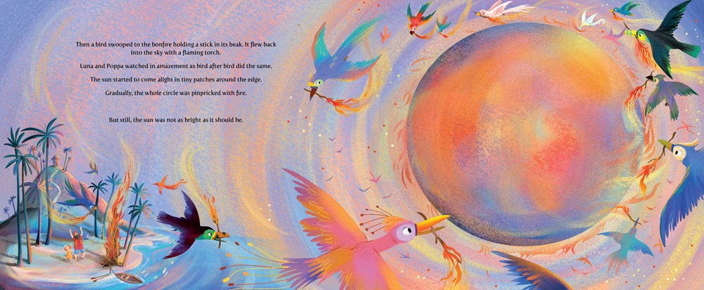 In this stand-alone starring characters from Mending the Moon, Luna and Poppa set out on a second celestial rescue mission, finding fantastical solutions and enlisting an assortment of island creatures in their quest to return the fallen sun to the sky—and set it ablaze once more.