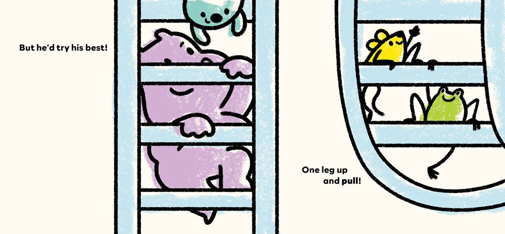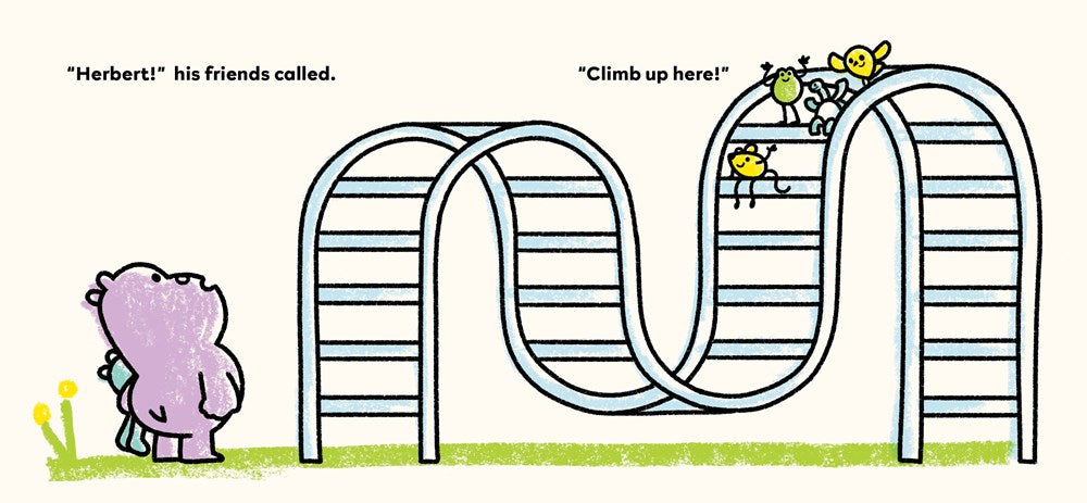 The fourth book in the adorable Hippo Park Pals series, real picture books--perfect for little hands!In the fourth book of the Hippo Park Pals, Herbert climbs to the top of the jungle gym for the first time. Of course, he has to look where he places his feet and balance each step of the way. Step! Pull! Step! Pull! Try not to wobble! He’s got it! And when Teddy (his stuffed bear) falls, Herbert imagines being a helicopter and making a heroic save!Rilla Alexander’s hippo siblings, Fiona and Herbert, are adorable and kind! Her colors and the social emotional messages in these precious books meet kids exactly where they are.