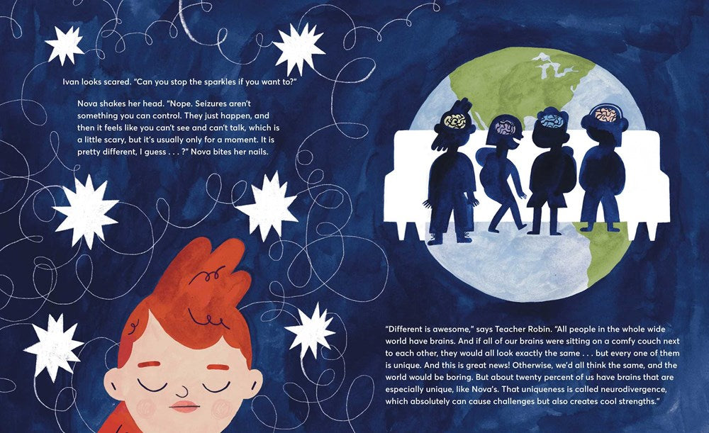 When Nova tells the class about her epilepsy, at first they’re confused, and she starts to worry, are her brain sparkles too unique? But Nova isn’t the only one in her class with a unique brain, and when her classmates start sharing too, what follows is a fun exploration of all the wonderful ways people and their brains are different.