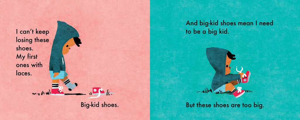 This big kid is wearing his first pair of big-kid shoes, the kind with laces! Even though they’re a little on the roomy side—shoes to grow into, of course—he knows he can take care of them. Except they keep falling off!