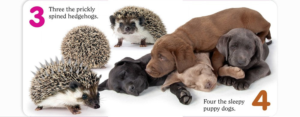 Photographs capturing the life and character of cute critters from parrots to puppies accompany bouncy rhyming text sure to delight little readers again and again as they learn the basics of numbers and counting.