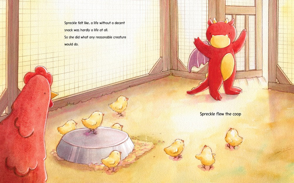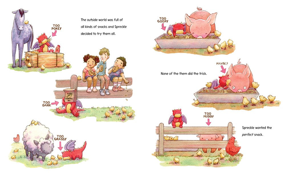 Spreckle the dragon lives on a farm with her loving family of chickens. It is a fine home, but she is fed up with their diet of dried corn and slugs, Spreckle explores the bounty of snacks the farm has to offer, from hay to pig slop. Tragically, nothing hits the spot.